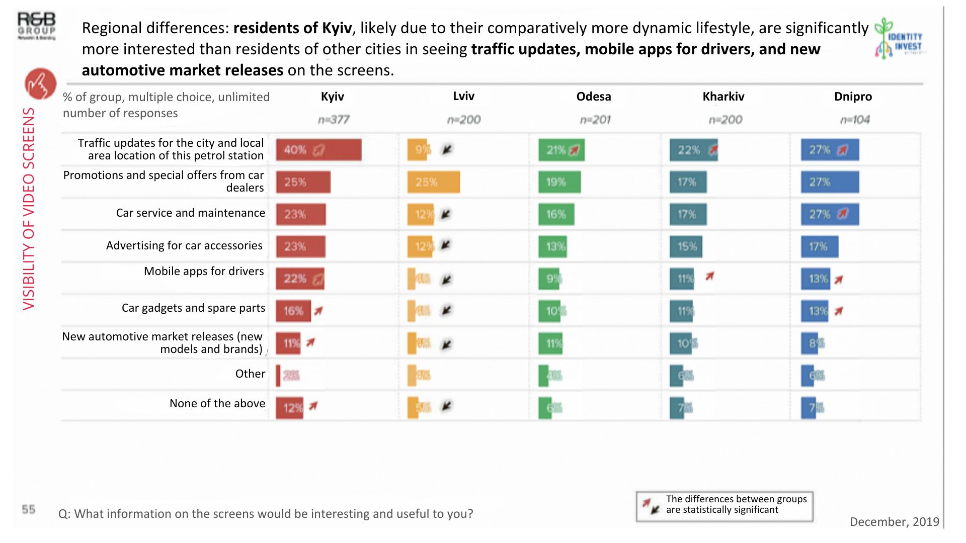 FYI: Identity Invest owns and operates 320 video screens installed at 151 fuel stations (set to reach 160 by the end of 2020). These are the top-selling stations across Ukraine, including prime locations in major cities and along key highways. The cost of placement (10 seconds, 252 spots per day) ranges from 189,600 to 129,000 UAH per month, excluding VAT. Content creation and adaptation are included in the placement fee.