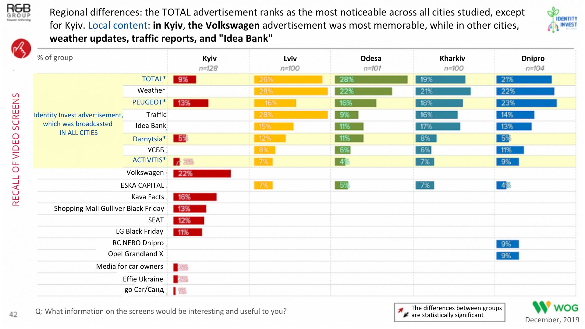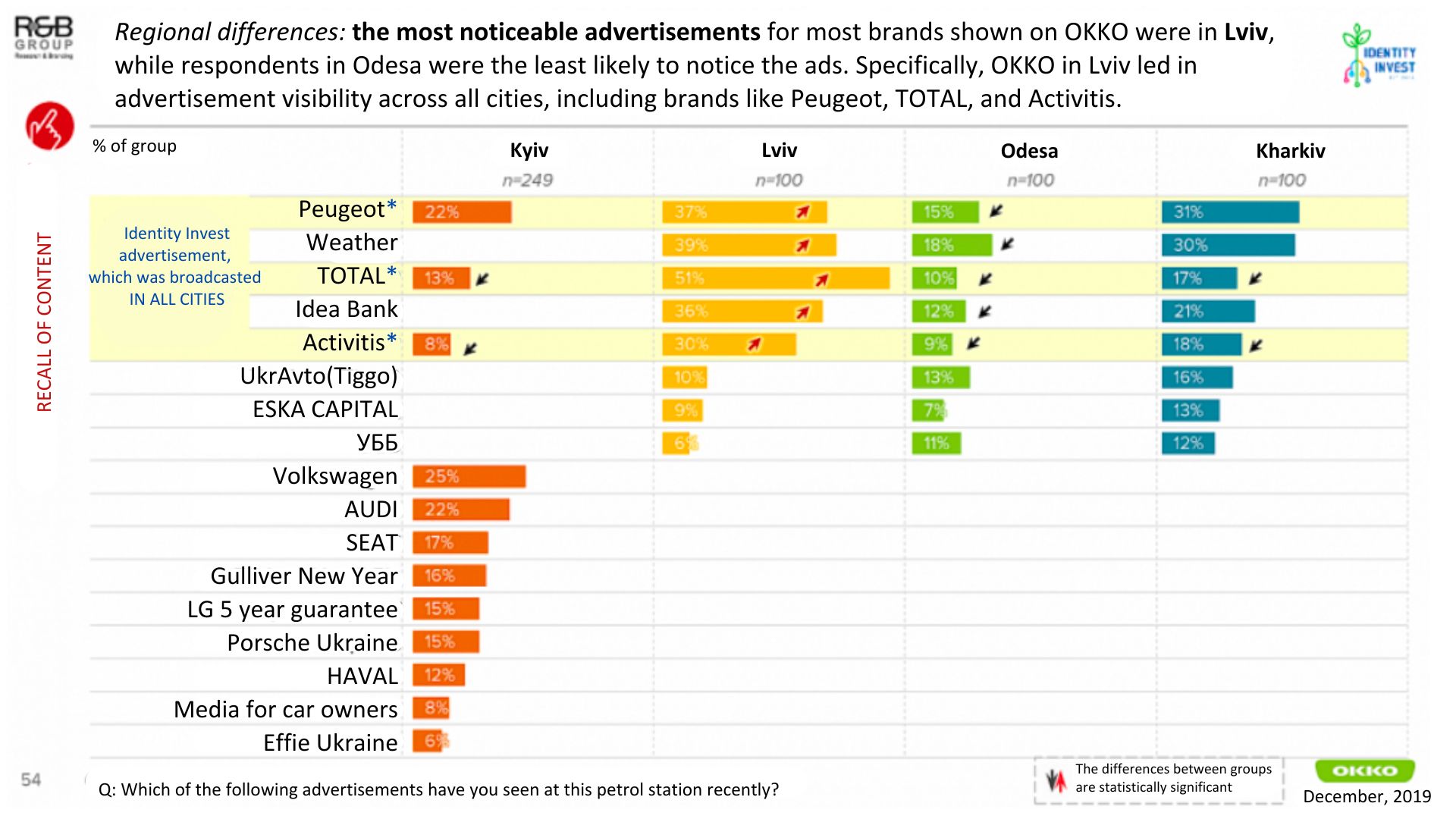 Regarding advertising content recall, we decided to provide a full list of advertisers for each fuel station operator, taking into account the geography of placements. The data includes all advertising partners of Identity Invest, social projects (such as the Ukrainian Charity Exchange, UBB), useful content (Traffic updates, Weather forecasts), and media channel branding (Media for Car Owners). However, these charts exclude performance data for fuel operators’ advertising campaigns due to confidentiality restrictions.