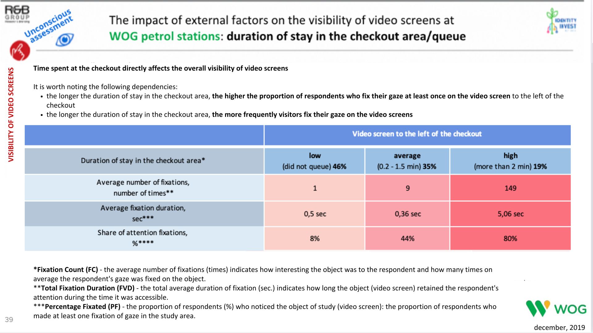 We also sought to analyse the impact of external factors, such as queue formation near the screen, on engagement with advertising content. For example, a two-minute queue in the checkout area increases video content consumption tenfold (!!!) from 0.5 seconds to 5 seconds, and the share of visitors fixating their attention on the video screen (from 8% to 80%).