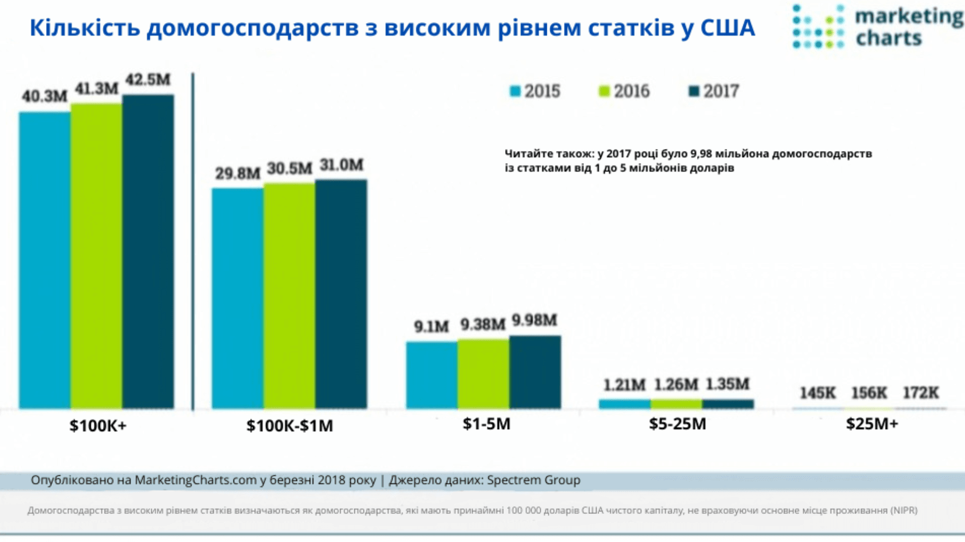 Під станом у США мають на увазі акції, цінні папери і прямі доходи, але виключають основне житло людини (primary residence). Показую картинку за 2017 рік, наочно демонструючи структуру доходів населення та щорічне зростання мільйонерів, але візьму в аналіз дані за 2018 рік (покликання на джерела наприкінці), щоб мати більш репрезентативну картину. Багатих у США стає більше. Кількість домогосподарств зі статком у $1–5 млн — 10,23 млн / 127,59 млн * 100 = 8,02 %! У мене був шок від різниці в 126 разів! Але навіть ультрабагатих американців ($5–25 млн) значно більше, а це дуже заможні люди, навіть за мірками США. Маємо такий розрахунок: 1,39 млн сімей / 127,59 млн * 100 = 1.09 %. Навіть якщо врахувати можливі похибки в розрахунках, різниця з Україною в 17 разів!
