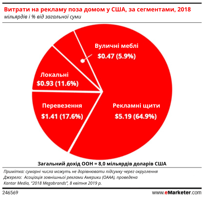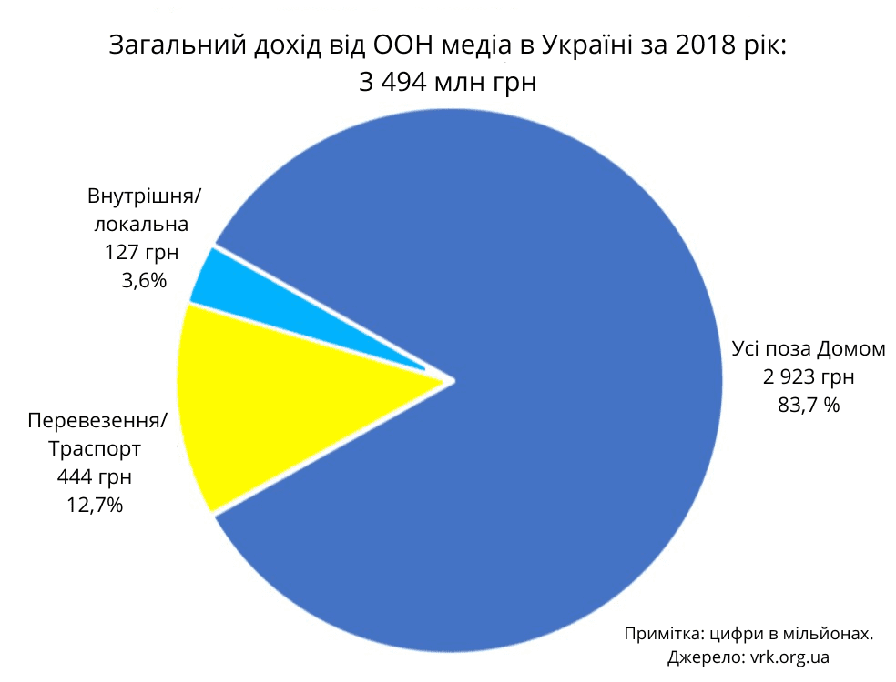 Медіа поза Домом займає 20 % ВСІХ РЕКЛАМНИХ ГРОШЕЙ КРАЇНИ або 3,49 млрд грн із 17,52. Раніше, у статті на Sostav, я намагався розібратися в нашій «медіааномалії». Хто не знав, український ООН у%-співвідношенні в 3,5 рази більше, ніж у середньому у світі. Можливо, за кордоном влада суворіша до «прикраси» пейзажів залізним частоколом конструкцій?! Чи медіаринок більш цивілізований та технологічний? Але, факт залишається фактом, Україна — країна друкованої зовнішньої реклами: лісів багато, люди «аналогові», влада «зговірлива». Далі ще цікавіше. В Україні ООН більше, ніж Digital медіа (2,52 млрд) та Радіо (578 млн) разом взятих!
