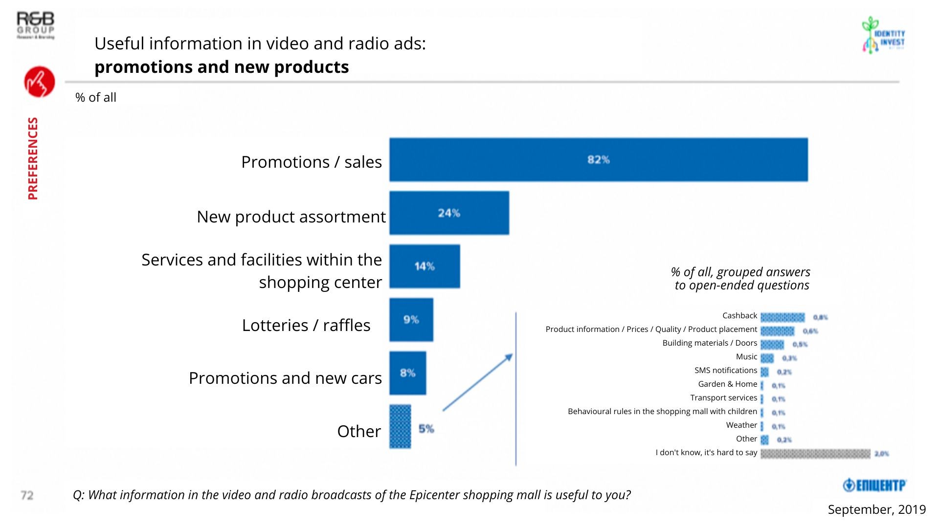 In addition, Identity Invest’s media projects are strictly a politics-free zone! This rule has been a solid foundation of our broadcasts for over 10 years. The primary focus of the commercial content is on news and promotional offers, which enhances the shopping experience and avoids causing rejection or irritation among visitors. As a result, every 5th respondent expressed a desire to receive more advertising messages, while 15% of car owners said they would like to learn about car promotions and new products through the “Epicentr Media Service” broadcasts.