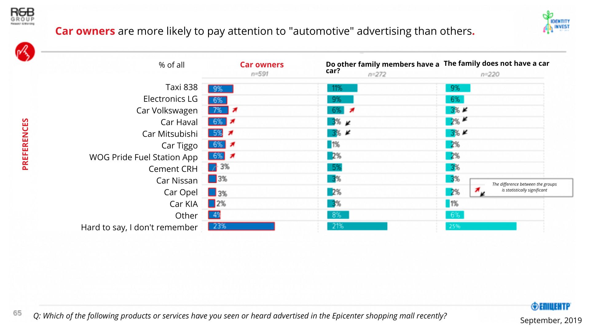 At the time of the survey (September 2019), the commercial broadcast schedule had a 100% fill rate, featuring 28 advertising campaigns throughout the day. Of these, only 12 campaigns were unrelated to the Epicentr brand. As shown in the data below, most visitors were able to recall the names of brands from the advertising campaigns they heard and saw within the shopping centres.