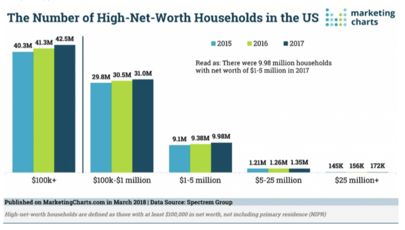 In the US, wealth is considered to include stocks, securities, and direct income, but excludes a person’s primary residence. I’m showing a chart from 2017 to clearly illustrate the structure of income and the annual growth of millionaires, but I’ll use 2018 data (source link at the end) to provide a more representative picture. The number of wealthy individuals in the US is growing. The number of households with a net worth between $1-5 million is 10.23 million / 127.59 million * 100 = 8.02%! I was shocked by the 126-fold difference! But even ultra-wealthy Americans ($5-25 million) are significantly more, and these are highly affluent individuals by US standards. Here’s the calculation: 1.39 million households / 127.59 million * 100 = 1.09%. Even considering potential calculation errors, the difference with Ukraine is 17 times!